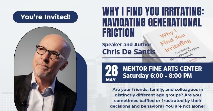 Our lives are filled with multiple generations, so you are likely to experience generational friction firsthand. Join organizational behavior expert Chris De Santis for a fun and informative evening presenting a fresh and provocative perspective on how we communicate across generations and traverse generational differences and similarities.