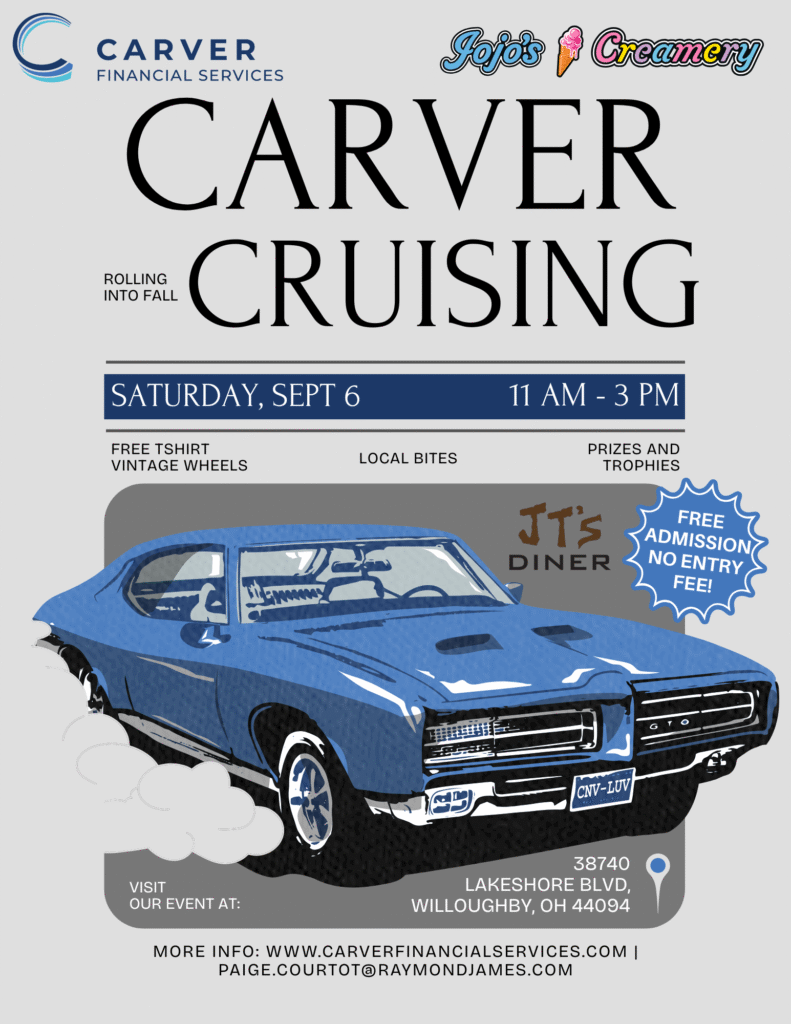 Get ready to rev your engines and roll into a night of classic cars, great food, and family fun at the Carver Cruisin’ Car Show, hosted at JT’s Diner in Willoughby, Ohio!