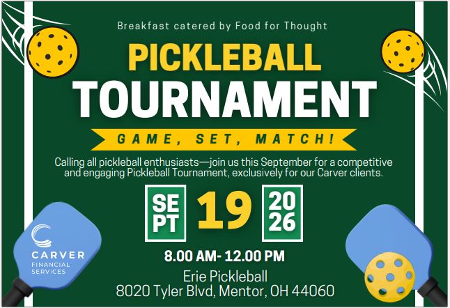 Get ready for a morning of friendly competition, connection, and community at the Carver Client Pickleball Tournament! This exclusive event — crafted especially for Carver clients — combines the thrill of play with an energizing social experience. Whether you’re a seasoned player or new to the game, this event is a great way to meet fellow clients, enjoy healthy competition, and kick off your weekend on a high note.