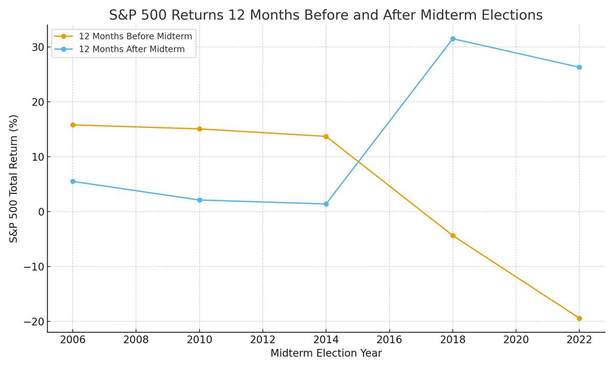 Below is a chart illustrating S&P 500 performance during the 12 months before and after the last several midterm elections. This visual underscores a historical trend: pre‑midterm uncertainty often gives way to strong post‑election recoveries. (source S&P.com)